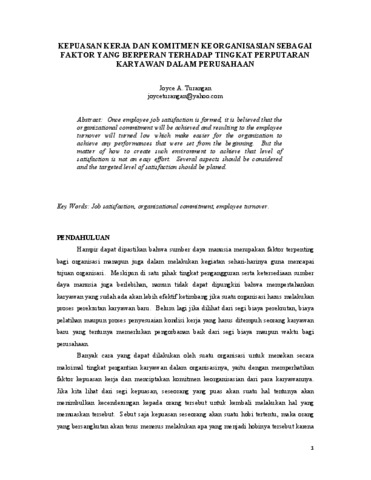 Once employee job satisfaction is formed, it is believed that theorganizational commitment will be achieved and resulting to the employeeturnover will turned low which make easier for the organization toachieve any performances that were set from the beginning. But thematter of how to create such environment to achieve that level ofsatisfaction is not an easy effort. Several aspects should be consideredand the targeted level of satisfaction should be planed.