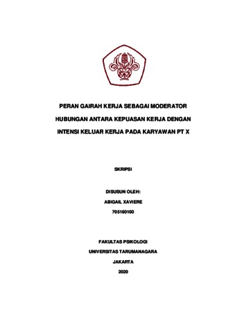 Xaviere, Abigail (2022) Abigail Xaviere (705160100) Peran Gairah Kerja sebagai Moderator Hubungan antara Kepuasan Kerja dengan Intensi Keluar Kerja pada Karyawan PT X. Skripsi thesis, Universitas Tarumanagara.