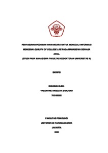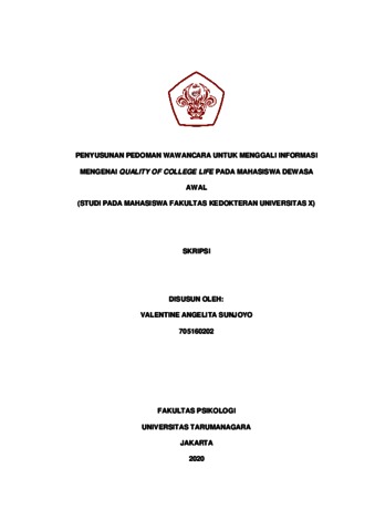 Sunjoyo, Valentine Angelita (2022) Penyusunan Pedoman Wawancara untuk Menggali Informasi mengenai Quality Of College Life pada Mahasiswa Dewasa Awal (Studi pada Mahasiswa Fakultas Kedokteran Universitas X). Skripsi thesis, Universitas Tarumanagara.