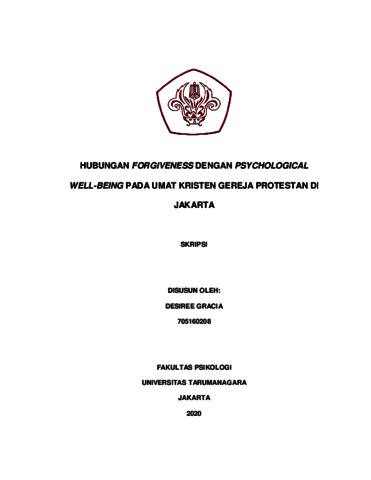 Gracia, Desiree (2022) Hubungan Forgiveness Dengan Psychological Well-Being pada Umat Kristen Gereja Protestan di Jakarta. Skripsi thesis, Universitas Tarumanagara.