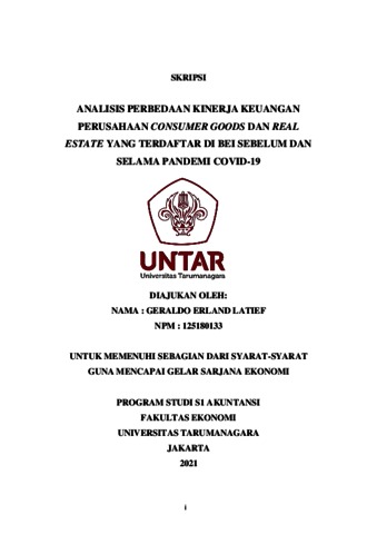 LATIEF, GERALDO ERLAND (2021) ANALISIS PERBEDAAN KINERJA KEUANGAN PERUSAHAAN CONSUMER GOODS DAN REAL ESTATE YANG TERDAFTAR DI BEI SEBELUM DAN SELAMA PANDEMI COVID-19. Skripsi thesis, Universitas Tarumanagara.