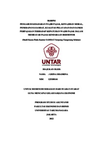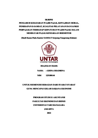 SHADRINA, GHINA (2021) PENGARUH KESADARAN WAJIB PAJAK, KEWAJIBAN MORAL, PENERAPAN E-SAMSAT, KUALITAS PELAYANAN DAN SANKSI PERPAJAKAN TERHADAP KEPATUHAN WAJIB PAJAK DALAM MEMBAYAR PAJAK KENDARAAN BERMOTOR (Studi Kasus Pada Kantor SAMSAT Serpong- Tangerang Selatan). Skripsi thesis, Universitas Tarumanagara.