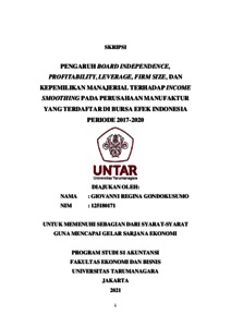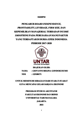 GONDOKUSUMO, GIOVANNI REGINA (2021) PENGARUH BOARD INDEPENDENCE, PROFITABILITY, LEVERAGE, FIRM SIZE, DAN KEPEMILIKAN MANAJERIAL TERHADAP INCOME SMOOTHING PADA PERUSAHAAN MANUFAKTUR YANG TERDAFTAR DI BURSA EFEK INDONESIA PERIODE 2017-2020. Skripsi thesis, Universitas Tarumanagara.