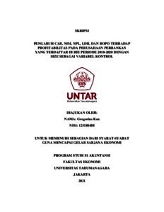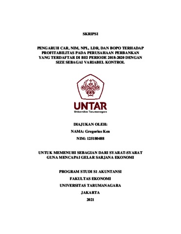 Ken, Gregorius (2021) PENGARUH CAR, NIM, NPL, LDR, DAN BOPO TERHADAP PROFITABILITAS PADA PERUSAHAAN PERBANKAN YANG TERDAFTAR DI BEI PERIODE 2018-2020 DENGAN SIZE SEBAGAI VARIABEL KONTROL. Skripsi thesis, Universitas Tarumanagara.