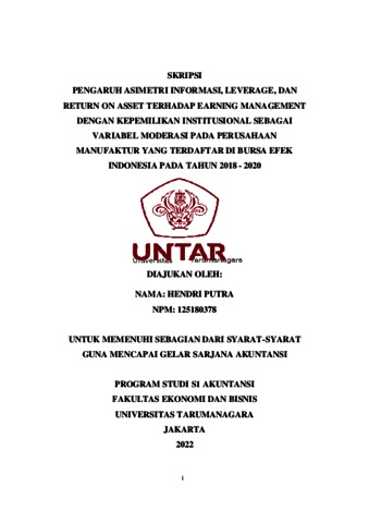 PUTRA, HENDRI (2021) PENGARUH ASIMETRI INFORMASI , LEVERAGE, DAN RETURN ON ASSET TERHADAP EARNING MANAGEMENT DENGAN KEPEMILIKAN INSTITUSIONAL SEBAGAI VARIABEL MODERASI PADA PERUSAHAAN MANUFAKTUR YANG TERDAFTAR DI BURSA EFEK INDONESIA PADA TAHUN 2018 - 2020. Skripsi thesis, Universitas Tarumanagara.