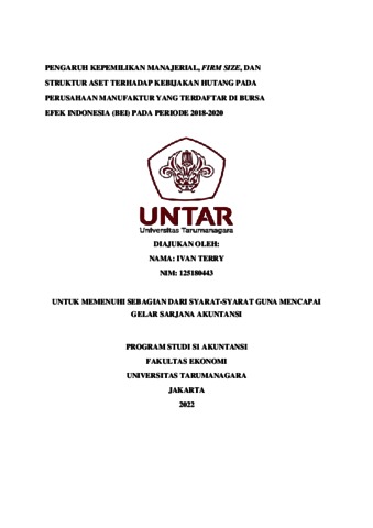 TERRY, IVAN (2021) PENGARUH KEPEMILIKAN MANAJERIAL, FIRM SIZE, DAN STRUKTUR ASET TERHADAP KEBIJAKAN HUTANG PADA PERUSAHAAN MANUFAKTUR YANG TERDAFTAR DI BURSA EFEK INDONESIA (BEI) PADA PERIODE 2018-2020. Skripsi thesis, Universitas Tarumanagara.