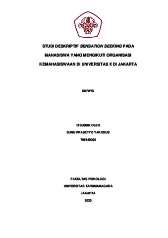 Y, Sunu Prasetyo (2022) Studi Deskriptif Sensation Seeking pada Mahasiswa yang Mengikuti Organisasi Kemahasiswaan di Universitas X di Jakarta. Skripsi thesis, Universitas Tarumanagara.