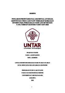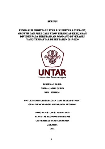 QUINN, JASO (2021) PENGARUH PROFITABILITAS, LIKUIDITAS, LEVERAGE, GROWTH DAN FREE CASH FLOW TERHADAP KEBIJAKAN DIVIDEN PADA PERUSAHAAN FOOD AND BEVERAGES YANG TERDAFTAR DI BEI TAHUN 2017-2020. Skripsi thesis, Universitas Tarumanagara.