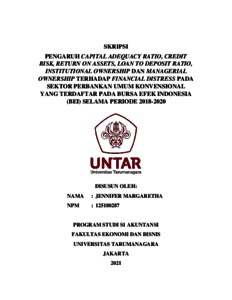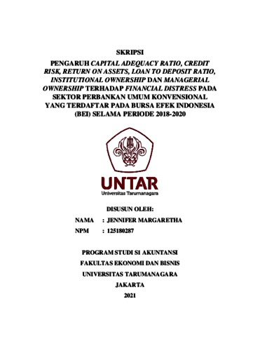 MARGARETHA, JENNIFER (2021) PENGARUH CAPITAL ADEQUACY RATIO, CREDIT RISK, RETURN ON ASSETS, LOAN TO DEPOSIT RATIO, INSTITUTIONAL OWNERSHIP DAN MANAGERIAL OWNERSHIP TERHADAP FINANCIAL DISTRESS PADA SEKTOR PERBANKAN UMUM KONVENSIONAL YANG TERDAFTAR PADA BURSA EFEK INDONESIA (BEI) SELAMA PERIODE 2018-2020. Skripsi thesis, Universitas Tarumanagara.