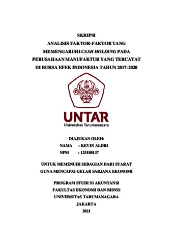 ALDRI, KEVIN (2021) ANALISIS FAKTOR-FAKTOR YANG MEMENGARUHI CASH HOLDING PADA PERUSAHAAN MANUFAKTUR YANG TERCATAT DI BURSA EFEK INDONESIA TAHUN 2017-2020. Skripsi thesis, Universitas Tarumanagara.