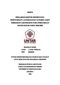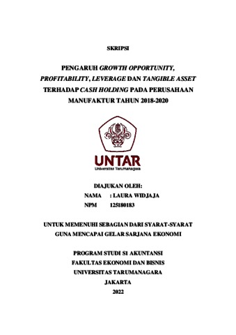 WIDJAJA, LAURA (2021) PENGARUH GROWTH OPPORTUNITY, PROFITABILITY, LEVERAGE DAN TANGIBLE ASSET TERHADAP CASH HOLDING PADA PERUSAHAAN MANUFAKTUR TAHUN 2018-2020. Skripsi thesis, Universitas Tarumanagara.