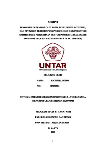 MILLIANTO, LICI (2021) PENGARUH OPERATING CASH FLOW, INVESTMENT ACTIVITIES, DAN LEVERAGE TERHADAP CORPORATE CASH HOLDING (STUDI EMPIRIS PADA PERUSAHAAN SEKTOR PROPERTI, REAL ESTATE DAN KONSTRUKSI YANG TERDAFTAR DI BEI 2018-2020). Skripsi thesis, Universitas Tarumanagara.