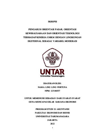 FORTUNA, LING LING (2021) PENGARUH ORIENTASI PASAR, ORIENTASI KEWIRAUSAHAAN DAN ORIENTASI TEKNOLOGI TERHADAP KINERJA UMKM DENGAN LINGKUNGAN EKSTERNAL SEBAGAI VARIABEL MODERASI. Skripsi thesis, Universitas Tarumanagara.