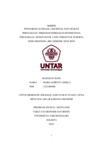 ANGELA, MARIA GORETTI (2021) PENGARUH LEVERAGE, LIKUIDITAS, DAN UKURAN PERUSAHAAN TERHADAP KEBIJAKAN DIVIDEN PADA PERUSAHAAN MANUFAKTUR YANG TERDAFTAR DI BURSA EFEK INDONESIA (BEI) PERIODE 2018 – 2020. Skripsi thesis, Universitas Tarumanagara.