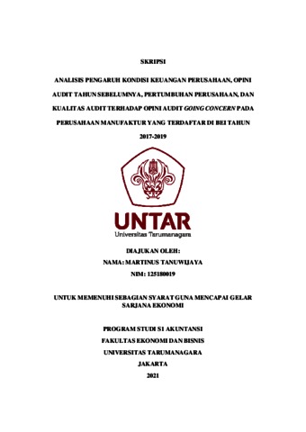 TANUWIJAYA, MARTINUS (2021) PENGARUH KUALITAS AUDIT, KONDISI KEUANGAN PERUSAHAAN, PERTUMBUHAN PERUSAHAAN, DAN OPINI AUDIT TAHUN SEBELUMNYA TERHADAP PENERIMAAN OPINI AUDIT GOING CONCERN PADA PERUSAHAAN MANUFAKTUR YANG TERDAFTAR DI BURSA EFEK INDONESIA PADA TAHUN 2017-2019. Skripsi thesis, Universitas Tarumanagara.