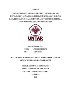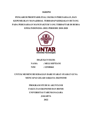 SEPTIANI, MELI (2021) PENGARUH PROFITABILITAS, UKURAN PERUSAHAAN, DAN KEPEMILIKAN MANAJERIAL TERHADAP KEBIJAKAN HUTANG PADA PERUSAHAAN MANUFAKTUR YANG TERDAFTAR DI BURSA EFEK INDONESIA (BEI) PERIODE 2018-2020. Skripsi thesis, Universitas Tarumanagara.