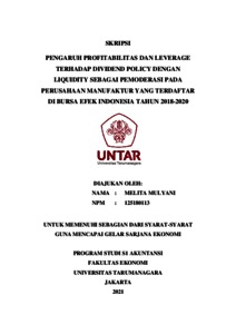 MULYANI, MELITA (2021) PENGARUH PROFITABILITY DAN LEVERAGE TERHADAP DIVIDEND POLICY DENGAN LIQUIDITY SEBAGAI PEMODERASI PADA PERUSAHAAN MANUFAKTUR YANG TERDAFTAR DI BURSA EFEK INDONESIA (BEI) TAHUN 2018-2020. Skripsi thesis, Universitas Tarumanagara.