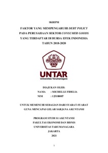 FIDELIA, MICHELLE (2021) FAKTOR YANG MEMPENGARUHI DEBT POLICY PADA PERUSAHAAN SEKTOR CONSUMER GOODS YANG TERDAFTAR DI BURSA EFEK INDONESIA TAHUN 2018-2020. Skripsi thesis, Universitas Tarumanagara.