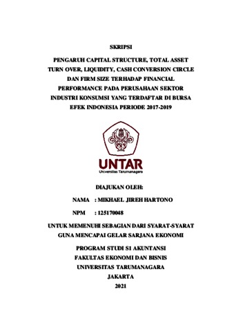 HARTONO, MIKHAEL JIREH (2021) PENGARUH CAPITAL STRUCTURE, TOTAL ASSET TURN OVER, LIQUIDITY, CASH CONVERSION CIRCLE DAN FIRM SIZE TERHADAP FINANCIAL PERFORMANCE PADA PERUSAHAAN SEKTOR INDUSTRI KONSUMSI YANG TERDAFTAR DI BURSA EFEK INDONESIA PERIODE 2017-2019. Skripsi thesis, Universitas Tarumanagara.