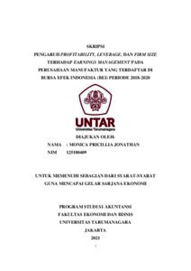JONATHAN, MONICA PRICILLIA (2021) PENGARUH PROFITABILITY, LEVERAGE, DAN FIRM SIZE TERHADAP EARNINGS MANAGEMENT PADA PERUSAHAAN MANUFAKTUR YANG TERDAFTAR DI BURSA EFEK INDONESIA (BEI) PERIODE 2018-2020. Skripsi thesis, Universitas Tarumanagara.