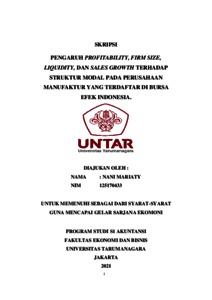 MARIATY, NANI (2021) PENGARUH PROFITABILITY, FIRM SIZE, LIQUDITIY DAN SALES GROWTH TERHADAP STRUKTUR MODAL PADA PERUSAHAAN MANUFAKTUR YANG TERDAFTAR DI BURSA EFEK INDONESIA. Skripsi thesis, Universitas Tarumanagara.