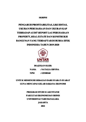 ERVINA, NATALIA (2021) PENGARUH PROFITABILITAS, LIKUIDITAS, UKURAN PERUSAHAAN DAN UKURAN KAP TERHADAP AUDIT REPORT LAG PERUSAHAAN PROPERTY, REAL ESTATE DAN KONSTRUKSI BANGUNAN YANG TERDAFTAR DI BURSA EFEK INDONESIA TAHUN 2019-2020. Skripsi thesis, Universitas Tarumanagara.