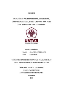 ANDREAINI, RACHEL (2021) Pengaruh Profitabilitas, Likuiditas, Capital intensity, Sales growth, dan Firm size terhadap Tax avoidance. Skripsi thesis, Universitas Tarumanagara.