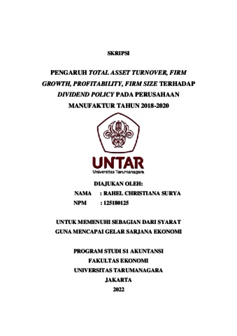SURYA, RAHEL CHRISTIANA (2021) PENGARUH TOTAL ASSET TURNOVER, FIRM GROWTH, PROFITABILITY, FIRM SIZE TERHADAP DIVIDEND POLICY PADA PERUSAHAAN MANUFAKTUR TAHUN 2018-2020. Skripsi thesis, Universitas Tarumanagara.