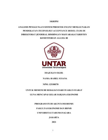 SUSANA, RAHEL (2021) ANALISIS PENGGUNAAN SISTEM PRESENSI ONLINE MENGGUNAKAN PENDEKATAN TECHNOLOGY ACCEPTANCE MODEL (TAM) DI DIREKTORAT JENDERAL BIMBINGAN MASYARAKAT KRISTEN KEMENTERIAN AGAMA RI. Skripsi thesis, Universitas Tarumanagara.