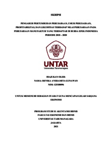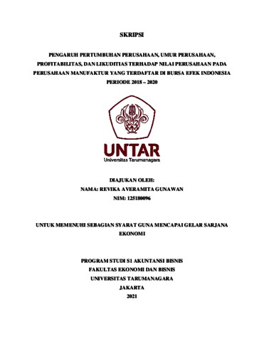 GUNAWAN, REVIKA AVERAMITA (2021) PENGARUH PERTUMBUHAN PERUSAHAAN, UMUR PERUSAHAAN, PROFITABILITAS, DAN LIKUIDITAS TERHADAP NILAI PERUSAHAAN PADA PERUSAHAAN MANUFAKTUR YANG TERDAFTAR DI BURSA EFEK INDONESIA PERIODE 2018 – 2020. Skripsi thesis, Universitas Tarumanagara.