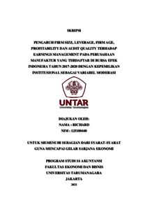 RICHARD, RICHARD (2021) PENGARUH FIRM SIZE, LEVERAGE, FIRM AGE, PROFITABILITY, DAN AUDIT QUALITY TERHADAP EARNINGS MANAGEMENT PADA PERUSAHAAN MANUFAKTUR YANG TERDAFTAR DI BURSA EFEK INDONESIA TAHUN 2017-2020 DENGAN KEPEMILIKAN INSTITUSIONAL SEBAGAI VARIABEL MODERASI. Skripsi thesis, Universitas Tarumanagara.