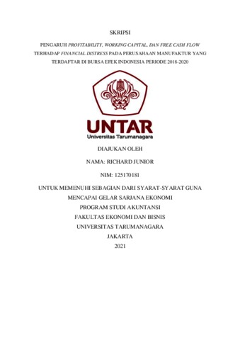 JUNIOR, RICHARD (2021) PENGARUH PROFITABILITY, WORKING CAPITAL, DAN FREE CASH FLOW TERHADAP FINANCIAL DISTRESS PADA PERUSAHAAN MANUFAKTUR YANG TERDAFTAR DI BURSA EFEK INDNESIA PERIODE 2018-2020. Skripsi thesis, Universitas Tarumanagara.