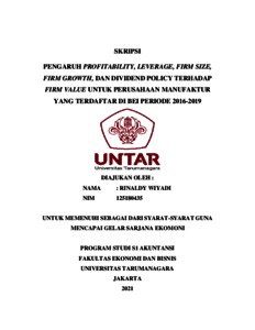 WIYADI, RINALDY (2021) PENGARUH PROFITABILITY, LEVERAGE, FIRM SIZE, FIRM GROWTH, DAN DIVIDEND POLICY TERHADAP FIRM VALUE UNTUK PERUSAHAAN MANUFAKTUR YANG TERDAFTAR DI BEI PERIODE 2016 – 2019. Skripsi thesis, Universitas Tarumanagara.