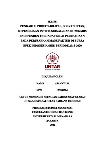 SANNY LO, SANNY LO (2021) PENGARUH PROFITABILITAS, SOLVABILITAS, KEPEMILIKAN INSTITUSIONAL, DAN KOMISARIS INDEPENDEN TERHADAP NILAI PERUSAHAAN PADA PERUSAHAAN MANUFAKTUR YANG TERDAFTAR DI BURSA EFEK INDONESIA (BEI) PERIODE 2018-2020. Skripsi thesis, Universitas Tarumanagara.