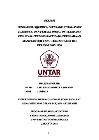 SOEANDI, SELSHA GABRIELLA (2021) PENGARUH LIQUIDITY, LEVERAGE, TOTAL ASSET TURNOVER, DAN FEMALE DIRECTOR TERHADAP FINANCIAL PERFORMANCE PADA PERUSAHAAN MANUFAKTUR YANG TERDAFTAR DI BEI PERIODE 2017-2020. Skripsi thesis, Universitas Tarumanagara.