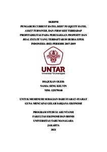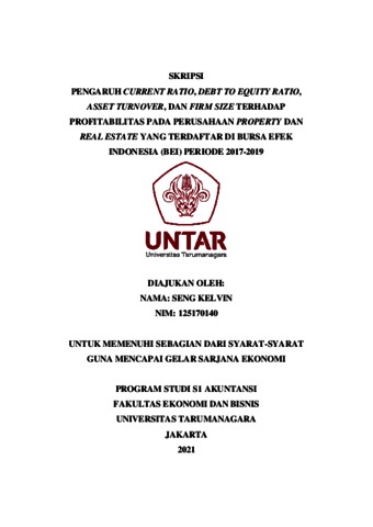 KELVIN, SENG (2021) PENGARUH CURRENT RATIO, DEBT TO EQUITY RATIO, ASSET TURNOVER, DAN FIRM SIZE TERHADAP PROFITABILITAS PADA PERUSAHAAN PROPERTY DAN REAL ESTATE YANG TERDAFTAR DI BURSA EFEK INDONESIA (BEI) PERIODE 2017-2019. Skripsi thesis, Universitas Tarumanagara.
