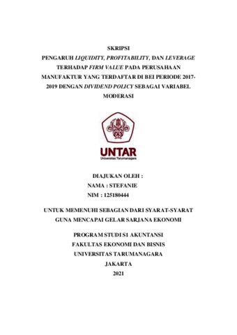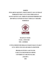 STEFANIE, STEFANIE (2021) PENGARUH LIQUIDITY, PROFITABILITY, DAN LEVERAGE PADA PERUSAHAAN MANUFAKTUR YANG TERDAFTAR DI BEI PERIODE 2017-2019 DENGAN DIVIDEND POLICY SEBAGAI VARIABEL MODERASI. Skripsi thesis, Universitas Tarumanagara.