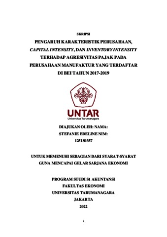 EDELINE, STEFANIE (2021) PENGARUH KARAKTERISTIK PERUSAHAAN, CAPITAL INTENSITY, DAN INVENTORY INTENSITY TERHADAP AGRESIVITAS PAJAK PERUSAHAAN MANUFAKTUR YANG TERDAFTAR DI BEI TAHUN 2017-2019. Skripsi thesis, Universitas Tarumanagara.