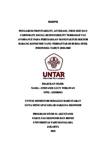 WIRAWAN, STEFANIE LUCY (2021) PENGARUH PROFITABILITY, LEVERAGE, FIRM SIZE DAN CORPORATE SOCIAL RESPONSIBILITY TERHADAP TAX AVOIDANCE PADA PERUSAHAAN MANUFAKTUR SEKTOR BARANG KONSUMSI YANG TERDAFTAR DI BURSA EFEK INDONESIA TAHUN 2018-2020. Skripsi thesis, Universitas Tarumanagara.