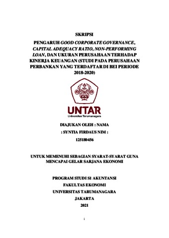 FIRDAUS, SYNTIA (2021) PENGARUH GOOD CORPORATE GOVERNANCE, CAPITAL ADEQUACY RATIO, NON-PERFORMING LOAN, DAN UKURAN PERUSAHAAN TERHADAP KINERJA KEUANGAN (STUDI PADA PERUSAHAAN PERBANKAN YANG TERDAFTAR DI BEI PERIODE 2018-2020). Skripsi thesis, Universitas Tarumanagara.