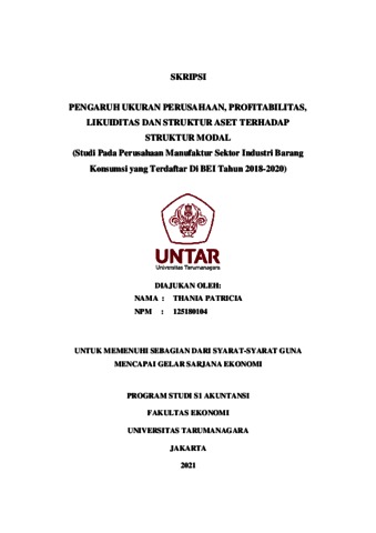 PATRICIA, THANIA (2021) PENGARUH UKURAN PERUSAHAAN, PROFITABILITAS, LIKUIDITAS DAN STRUKTUR ASET TERHADAP STRUKTUR MODAL. Skripsi thesis, Universitas Tarumanagara.