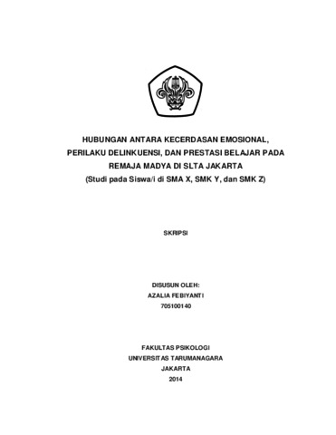 Azalia, Azalia (2022) HUBUNGAN ANTARA KECERDASAN EMOSIONAL, PERILAKU DELINKUENSI, DAN PRESTASI BELAJAR PADA REMAJA MADYA DI SLTA JAKARTA (Studi pada Siswa/i di SMA X, SMK Y, dan SMK Z). Skripsi thesis, Universitas Tarumanagara.