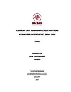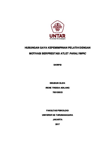 ADILANG, IRENE TREISIA (2022) Hubungan antara gaya kepemimpinan pelatih dengan motivasi berprestasi atlet Paralympic. Skripsi thesis, Universitas Tarumanagara.