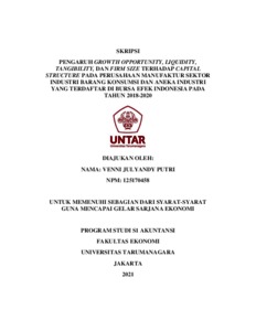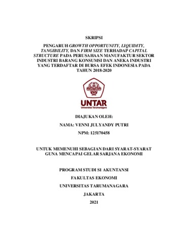 PUTRI, VENNI JULYANDY (2021) PENGARUH GROWTH OPPORTUNITY, LIQUIDITY, TANGIBILITY, DAN FIRM SIZE TERHADAP CAPITAL STRUCTURE PADA PERUSAHAAN MANUFAKTUR SEKTOR INDUSTRI BARANG KONSUMSI DAN ANEKA INDUSTRI YANG TERDAFTAR DI BURSA EFEK INDONESIA PADA TAHUN 2018-2020. Skripsi thesis, Universitas Tarumanagara.