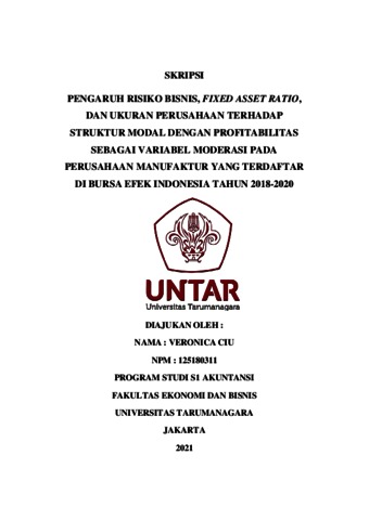 VERONICA CIU, VERONICA CIU (2021) PENGARUH RISIKO BISNIS, FIXED ASSET RATIO, DAN UKURAN PERUSAHAAN TERHADAP STRUKTUR MODAL DENGAN PROFITABILITAS SEBAGAI VARIABEL MODERASI PADA PERUSAHAAN MANUFAKTUR YANG TERDAFTAR DI BURSA EFEK INDONESIA TAHUN 2018-2020. Skripsi thesis, Universitas Tarumanagara.