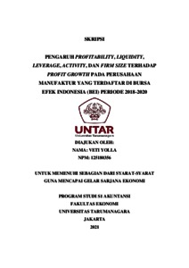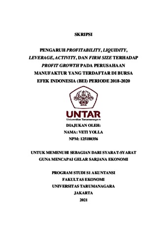 VETI YOLLA, VETI YOLLA (2021) PENGARUH PROFITABILITY, LIQUIDITY, LEVERAGE, ACTIVITY, DAN FIRM SIZE TERHADAP PROFIT GROWTH PADA PERUSAHAAN MANUFAKTUR YANG TERDAFTAR DI BURSA EFEK INDONESIA (BEI) PERIODE 2018-2020. Skripsi thesis, Universitas Tarumanagara.