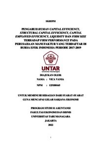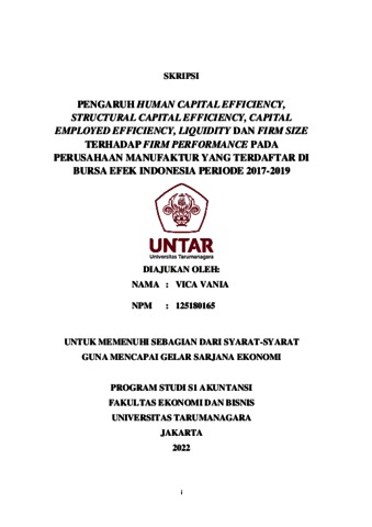 VANIA, VICA (2021) PENGARUH HUMAN CAPITAL EFFICIENCY, STRUCTURAL CAPITAL EFFICIENCY, CAPITAL EMPLOYED EFFICIENCY, LIQUIDITY, DAN FIRM SIZE TERHADAP FIRM PERFORMANCE PADA PERUSAHAAN MANUFAKTUR YANG TERDAFTAR DI BURSA EFEK INDONESIA PERIODE 2017-2019. Skripsi thesis, Universitas Tarumanagara.