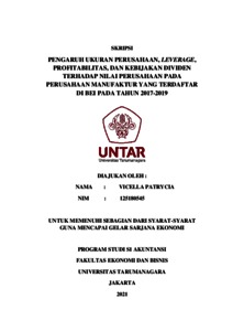 PATRYCIA, VICELLA (2021) PENGARUH UKURAN PERUSAHAAN, LEVERAGE, PROFITABILITAS, DAN KEBIJAKAN DIVIDEN TERHADAP NILAI PERUSAHAAN PADA PERUSAHAAN MANUFAKTUR YANG TERDAFTAR DI BEI PADA TAHUN 2017-2019. Skripsi thesis, Universitas Tarumanagara.