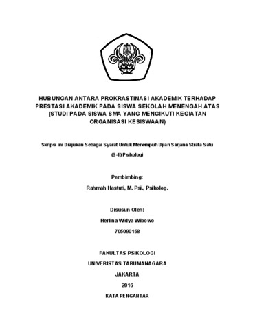 Wibowo, Herlina Widya (2022) Hubungan Prokrastinasi Akademik dengan Prestasi Akademik pada Siswa SMA di Jakarta (Studi pada Siswa yang Aktif dalam Organisasi Kesiswaan). Skripsi thesis, Universitas Tarumanagara.