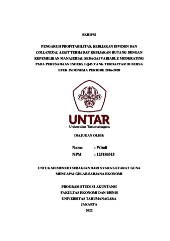Windi, Windi (2021) PENGARUH PROFITABILITAS, KEBIJAKAN DIVIDEN DAN COLLATERAL ASSET TERHADAP KEBIJAKAN HUTANG DENGAN KEPEMILIKAN MANAJERIAL SEBAGAI VARIABLE MODERATING. Skripsi thesis, Universitas Tarumanagara.